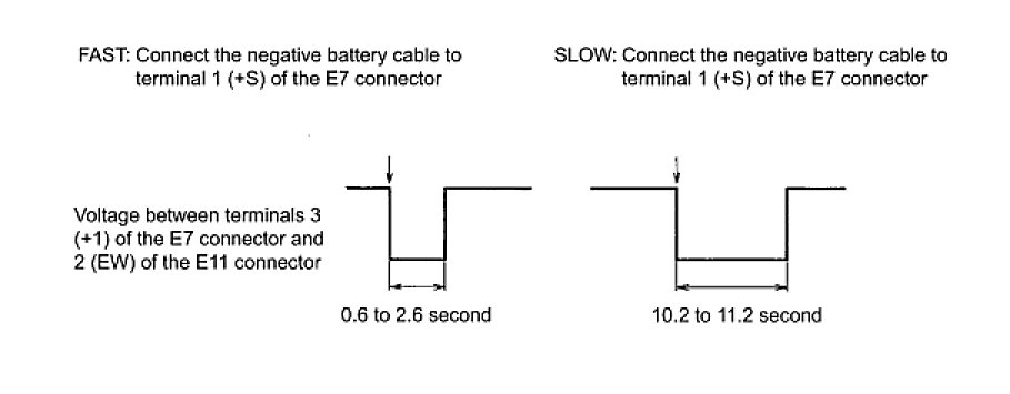 (2) Connect the battery positive lead to terminal 2 (+B) of the E7 connector and the battery negative lead to terminals 1 (+S) of the E7 connector and 2 (EW) of the E11 connector.