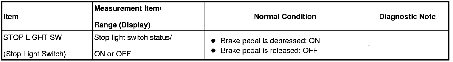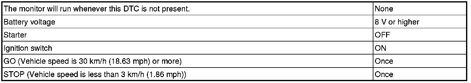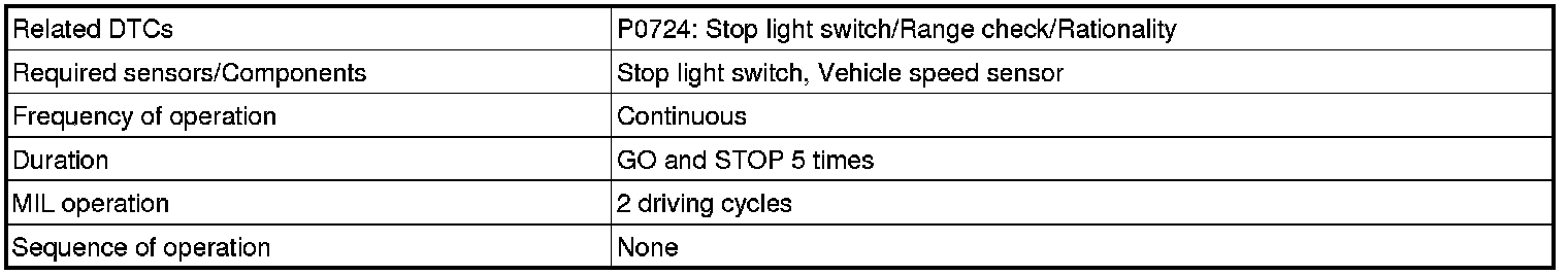 This DTC indicates that the stop light switch remains ON. When the stop light switch remains ON during GO and STOP driving, the ECM interprets this as a fault in the stop light switch. Then the MIL illuminates and the ECM stores the DTC. The vehicle must GO (30 km/h (18.63 mph) or more) and STOP (less than 3 km/h (1.86 mph)) 5 times for 2 driving cycles in order for the DTC to be output.