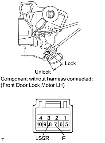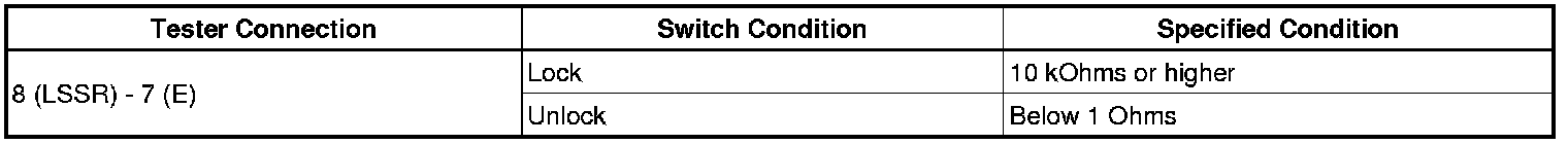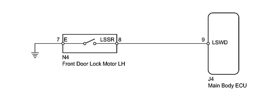 The driver side door unlock detection switch is built into the front driver's door lock motor. The switch turns on when the driver's door is unlocked and turns off when the door is locked. The main body ECU is connected to the front driver's door lock motor via terminal LSWD and driver's door lock/unlock state signals are input to the main body ECU. The main body ECU applies voltage to the door unlock detection switch via terminal LSWD. When the door unlock detection switch is off (there is continuity between the switch terminals), a lock state signal is input to the main body ECU. When the switch is on (there is no continuity between the switch terminals), an unlock state signal is input.
