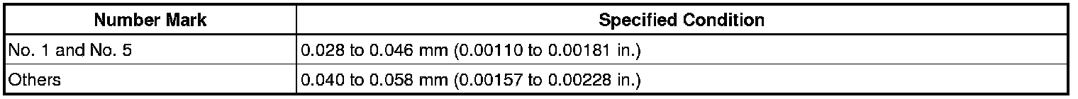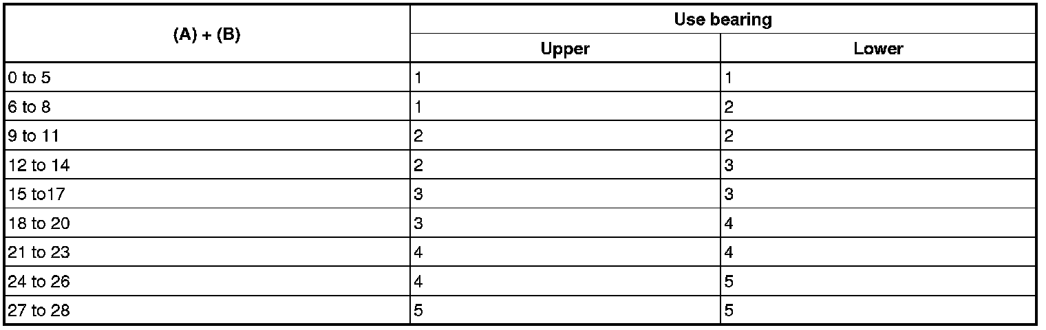 HINT: If replacing a standard bearing, replace it with one that has the same number. If the number of the bearing cannot be determined, select the correct bearing by adding together the numbers imprinted on the cylinder block and crankshaft. Then refer to the table below for the appropriate bearing number. There are 5 sizes of standard bearings. For No. 1 and No. 5 position bearings, use bearings marked 3, 4, 5, 6 and 7. For other position bearings, use bearings marked 1, 2, 3, 4 and 5.