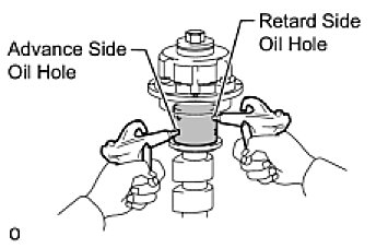 (4) Apply approximately 200 kPa (2.0 kgf/cm2, 29 psi) of air pressure to the 2 open oil holes (the advance side oil hole and the retard side oil hole).