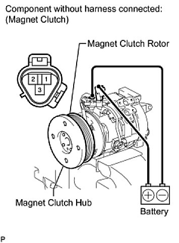 (1) Confirm that the magnet clutch hub and magnet clutch rotor lock when the battery positive lead is connected to terminal 3 of the magnet clutch, and the negative lead is connected to the ground wire.
