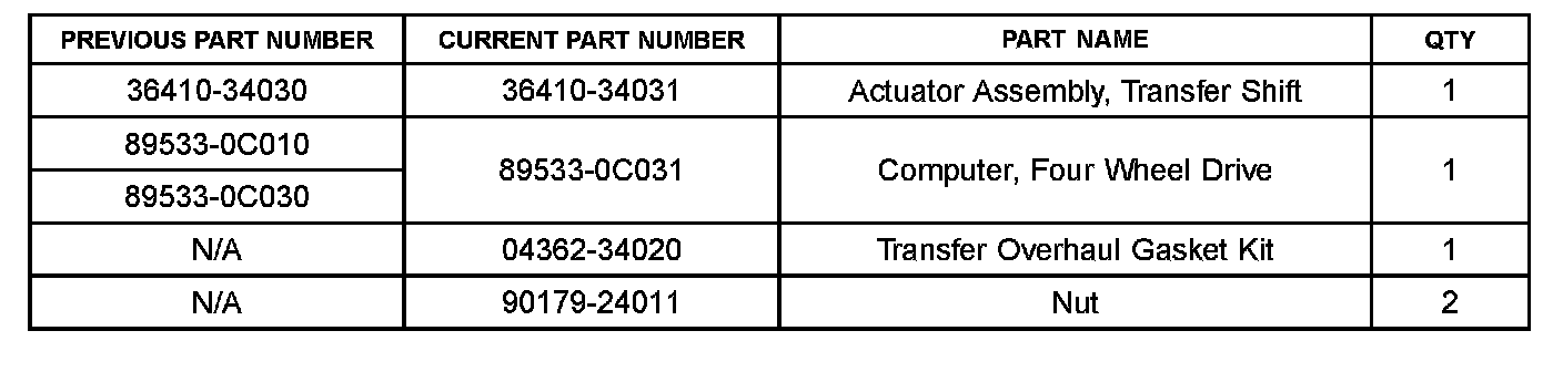 Some customers may be concerned about the inability to shift the transfer case between 2WD 4WD High and 4WD Low after an overnight cold soak with temperatures below freezing. An improved transfer case actuator and revised 4WD computer logic has been implemented for this condition.