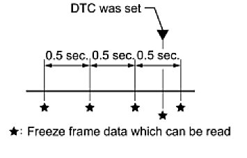 (b) The ECM records freeze frame data in 5 different instances: 1) 3 times before the DTC is set, 2) once when the DTC is set, and 3) once after the DTC is set. These data can be used to simulate the vehicle's condition around the time when the malfunction occurred. The data may help find the cause of the malfunction, or judge if the DTC is being caused by a temporary malfunction or not.