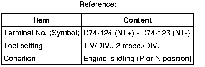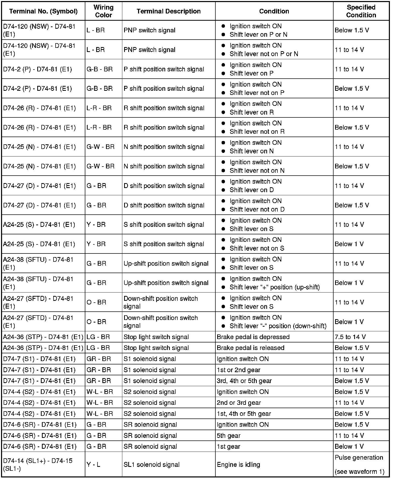 In the table, first follow the information under "Condition". Look under "Terminal No. (Symbol)" for the terminals to be inspected. The standard voltage between the terminals is shown under "Specified Condition".