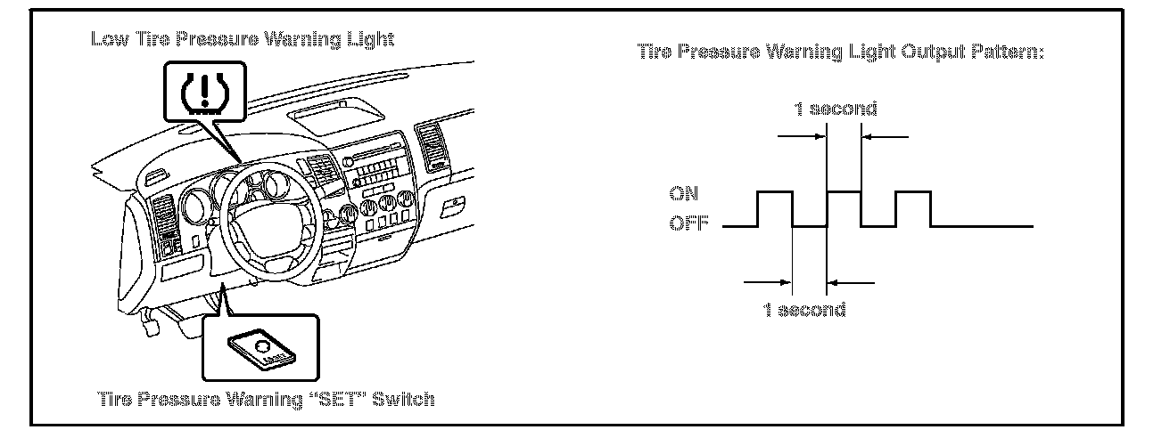 3. Push and hold the Tire Pressure Warning "SET" Switch for 3 seconds until the Low Tire Pressure Warning Light blinks 3 times and then turns OFF, indicating the system initialization has begun.