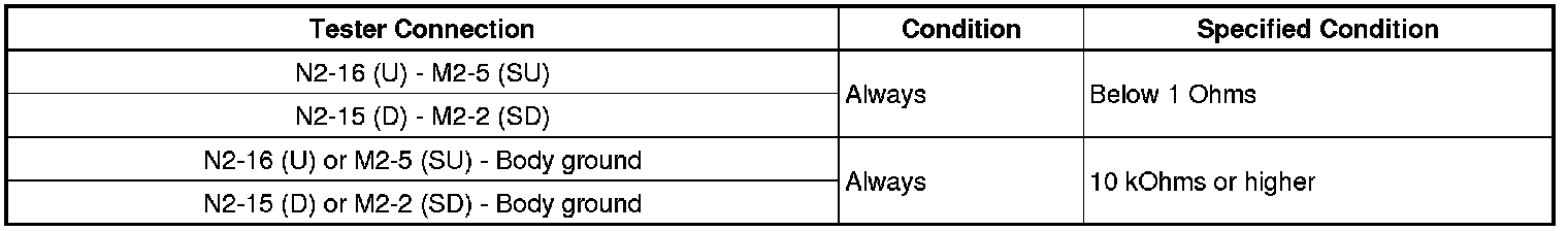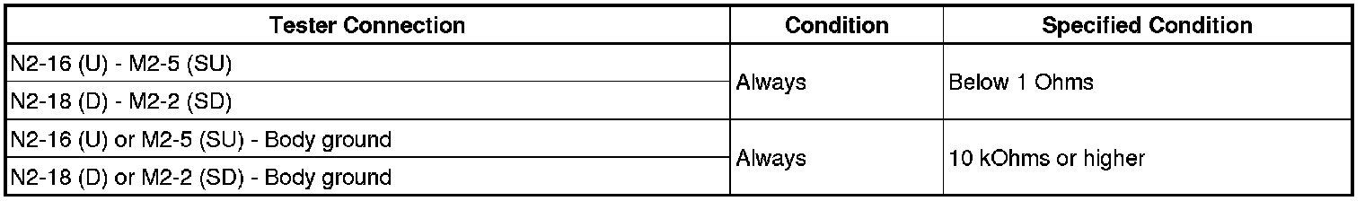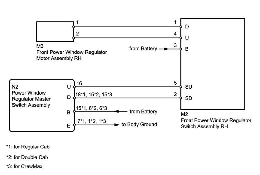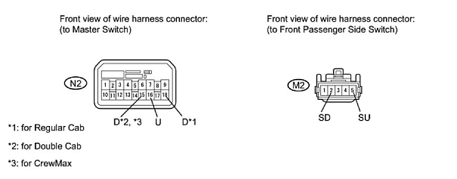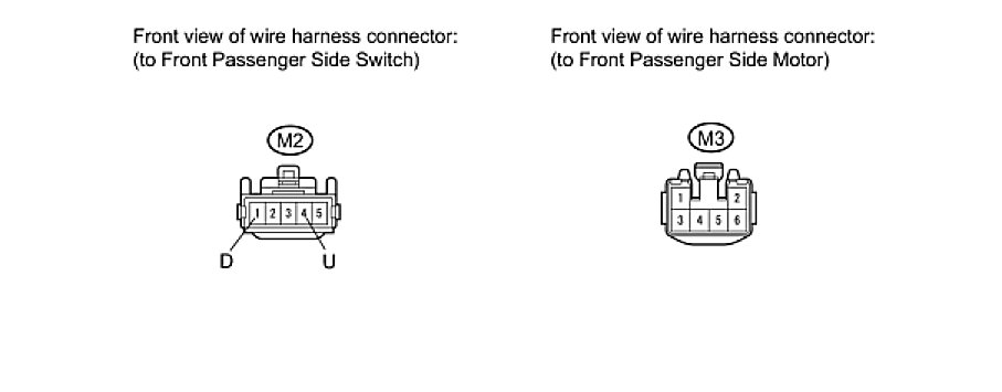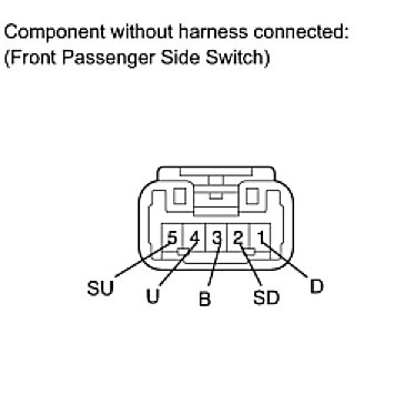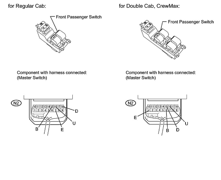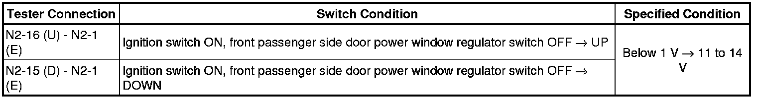 - If the front passenger side manual UP/DOWN function does not operate, there may be a malfunction in the power window regulator switch (for front passenger side), front power window regulator motor RH, power window regulator master switch or harness and connector.