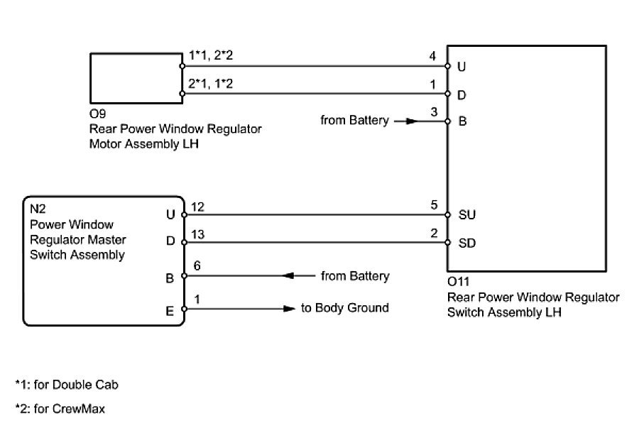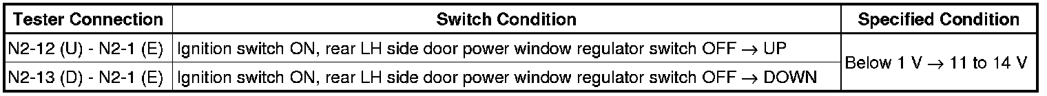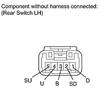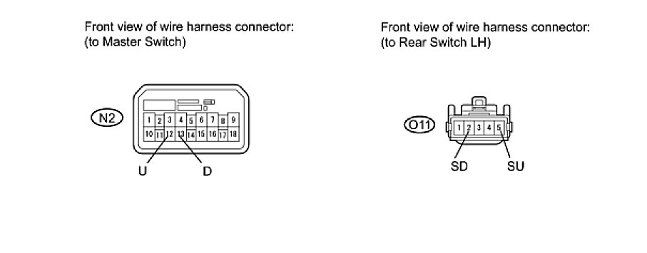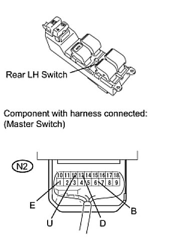 - If the rear LH side manual UP/DOWN function does not operate, there may be a malfunction in the rear power window regulator switch LH, rear power window regulator motor LH, power window regulator master switch or harness and connector.