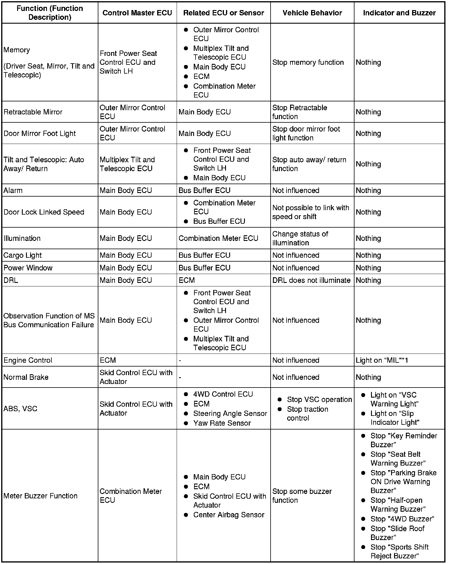 NOTE: *1: MIL lights on only during VSC or ABS failure status.