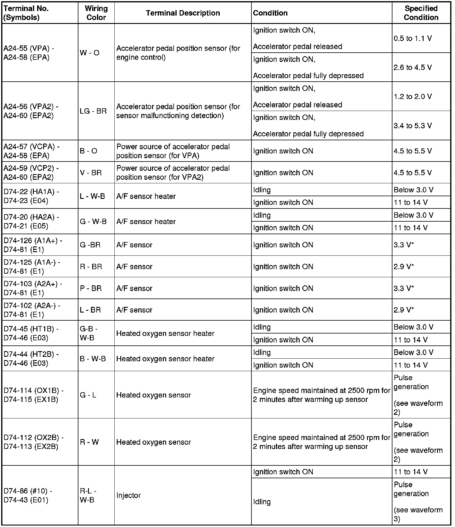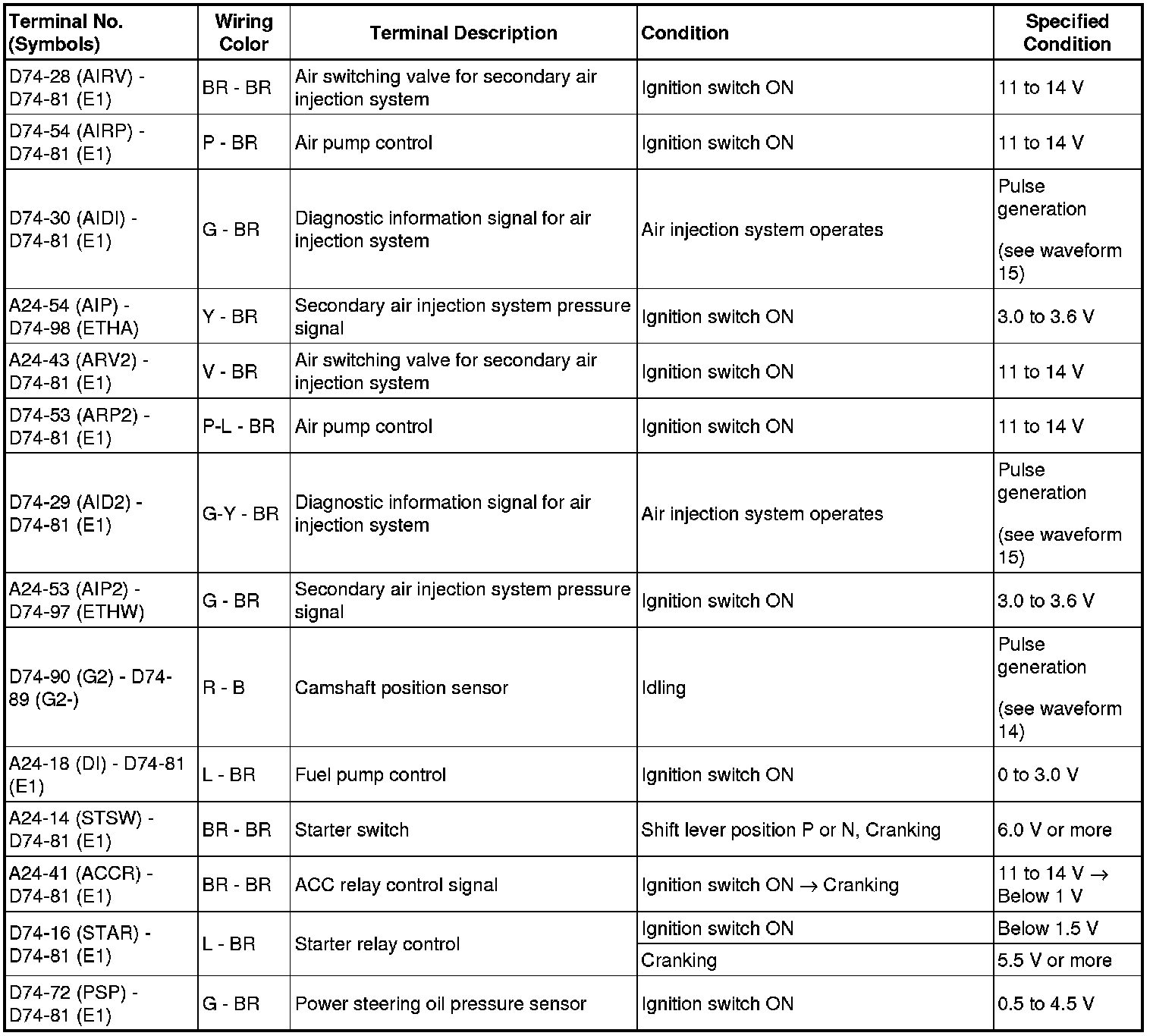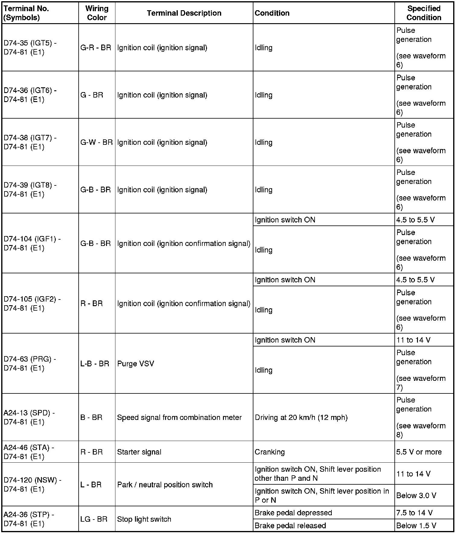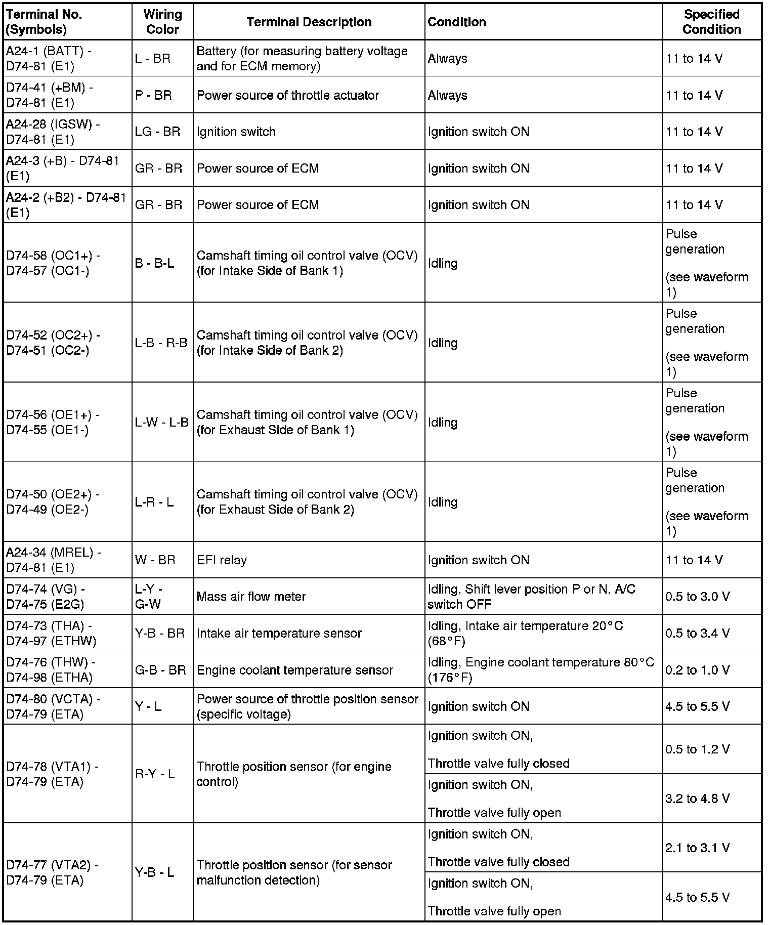 HINT: The standard normal voltage between each pair of ECM terminals is shown in the table below. The appropriate conditions for checking each pair of terminals are also indicated. The result of checks should be compared with the standard normal voltage for that pair of terminals, displayed in the Specified Condition column. The illustration above can be used as a reference to identify the ECM terminal locations.