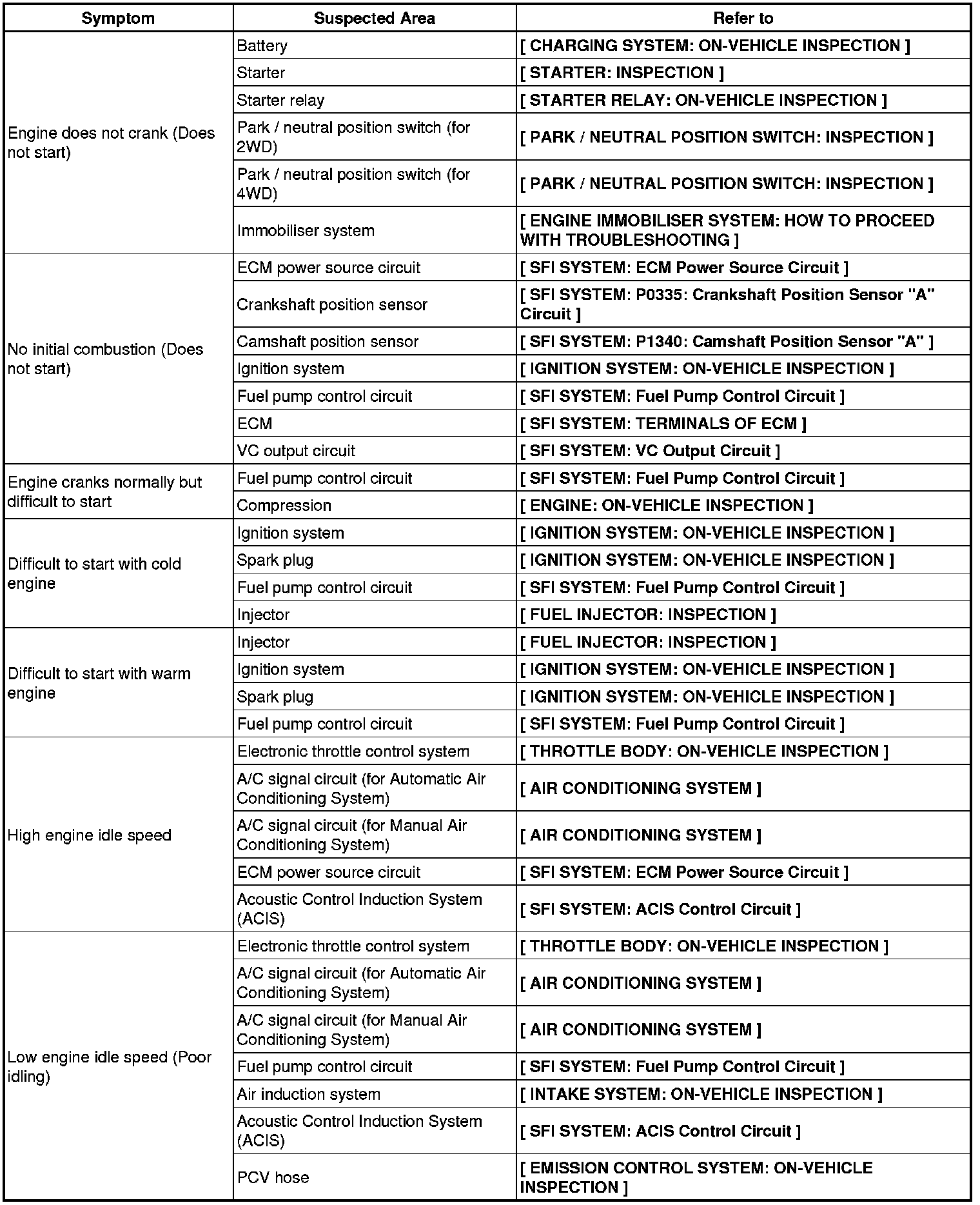 PROBLEM SYMPTOMS TABLE