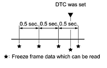 (b) The ECM records freeze frame data at 5 different times: 1) 3 times before the DTC is set, 2) once when the DTC is set, and 3) once after the DTC is set. These data can be used to simulate the vehicle's condition around the time when the malfunction occurred. The data may help find the cause of the malfunction, or judge if the DTC is being caused by a temporary malfunction or not.