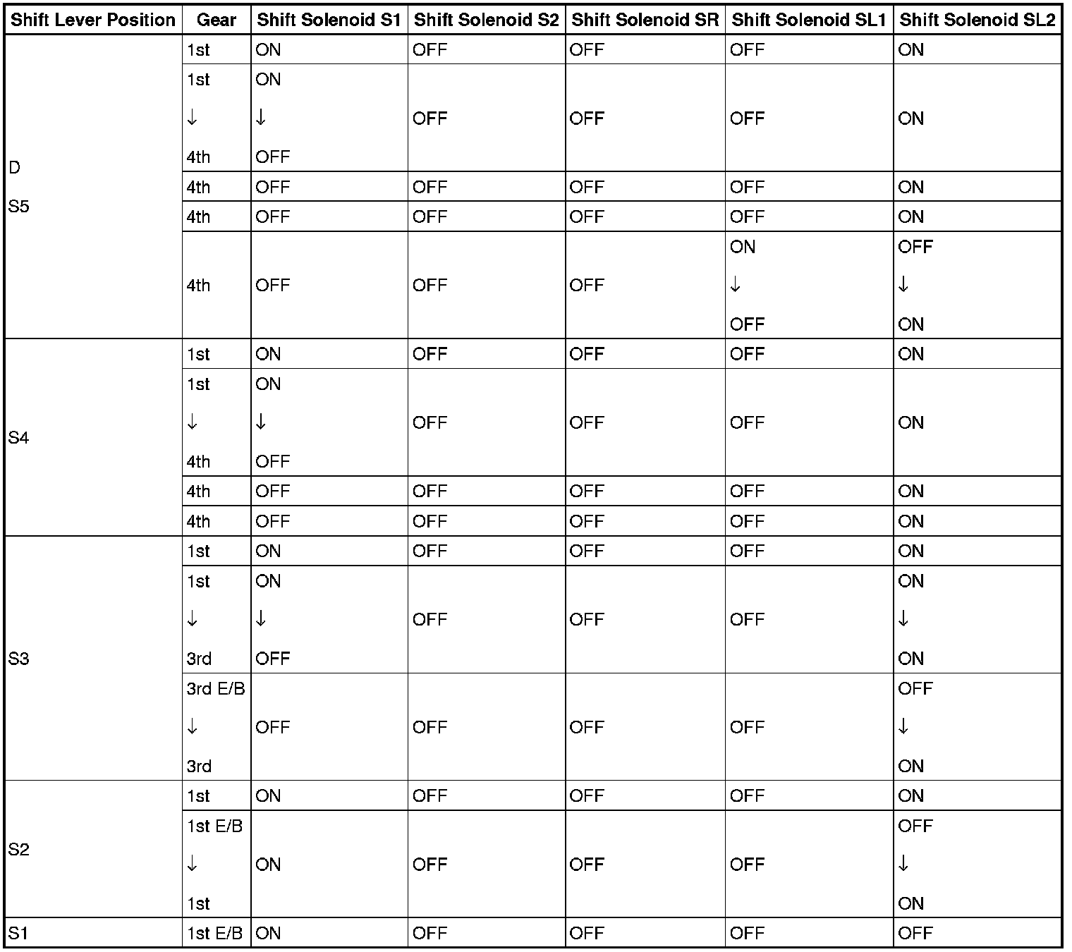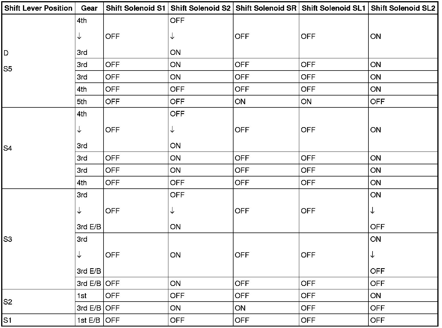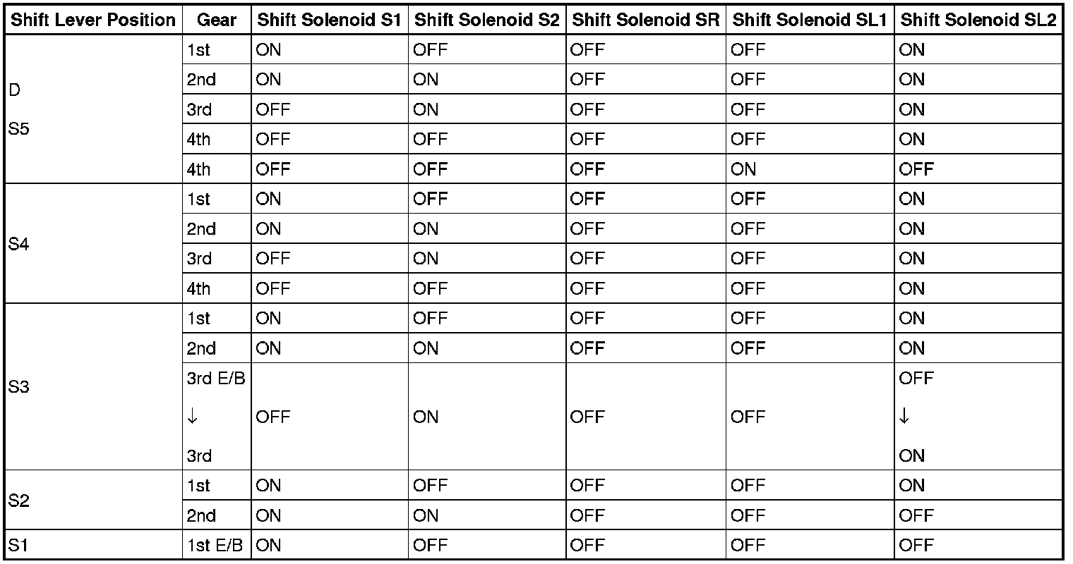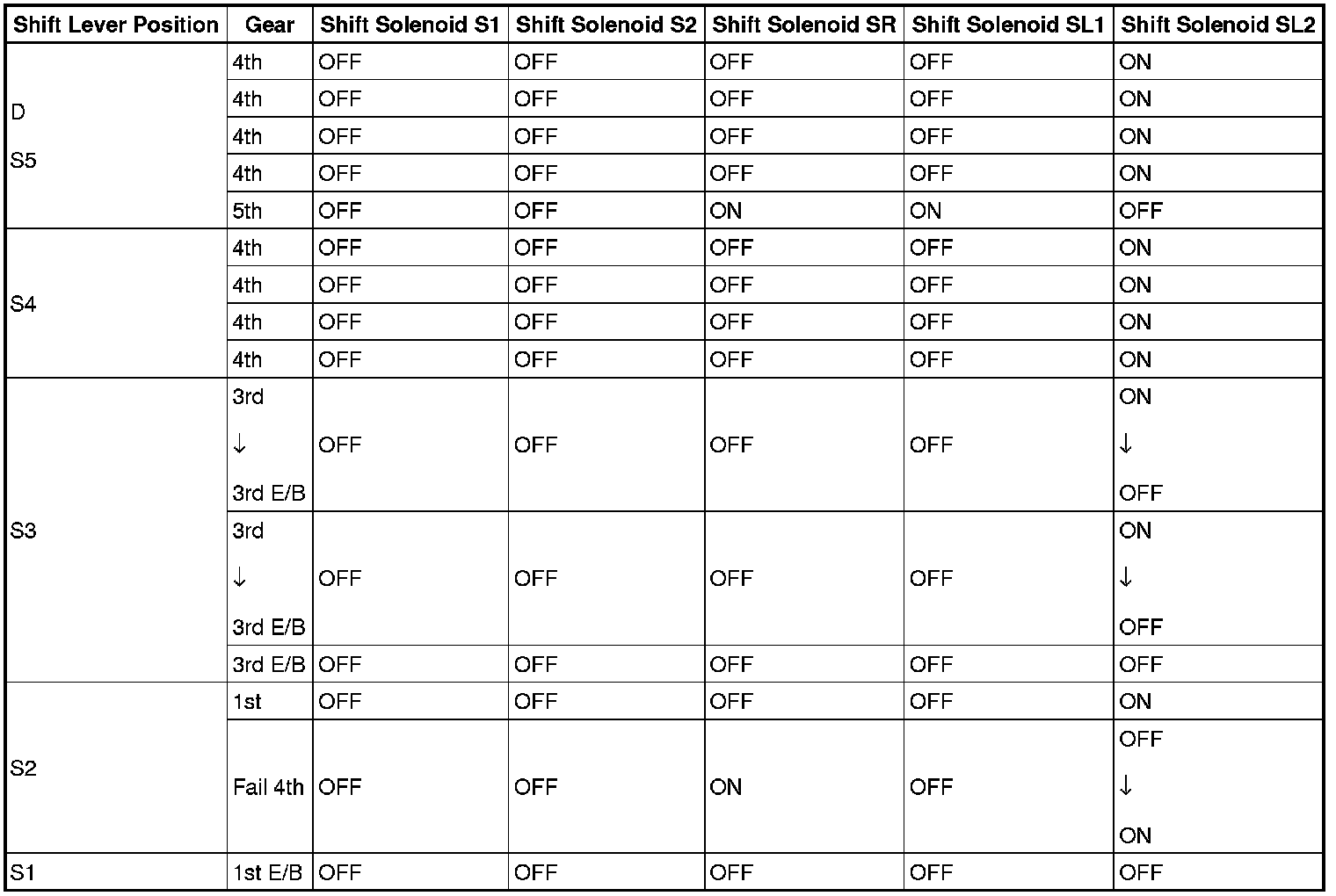 If any of the shift solenoid valve circuits has an open or short failure, the ECM turns the other shift solenoids ON and OFF in order to shift into the gear positions shown in the table below.