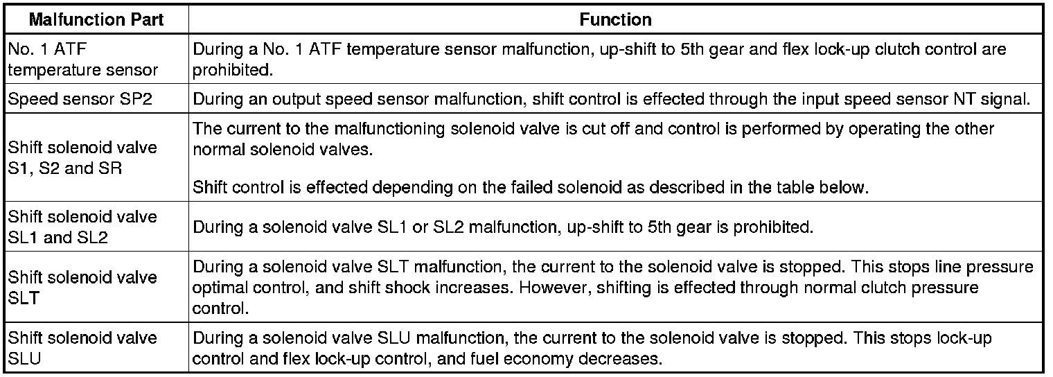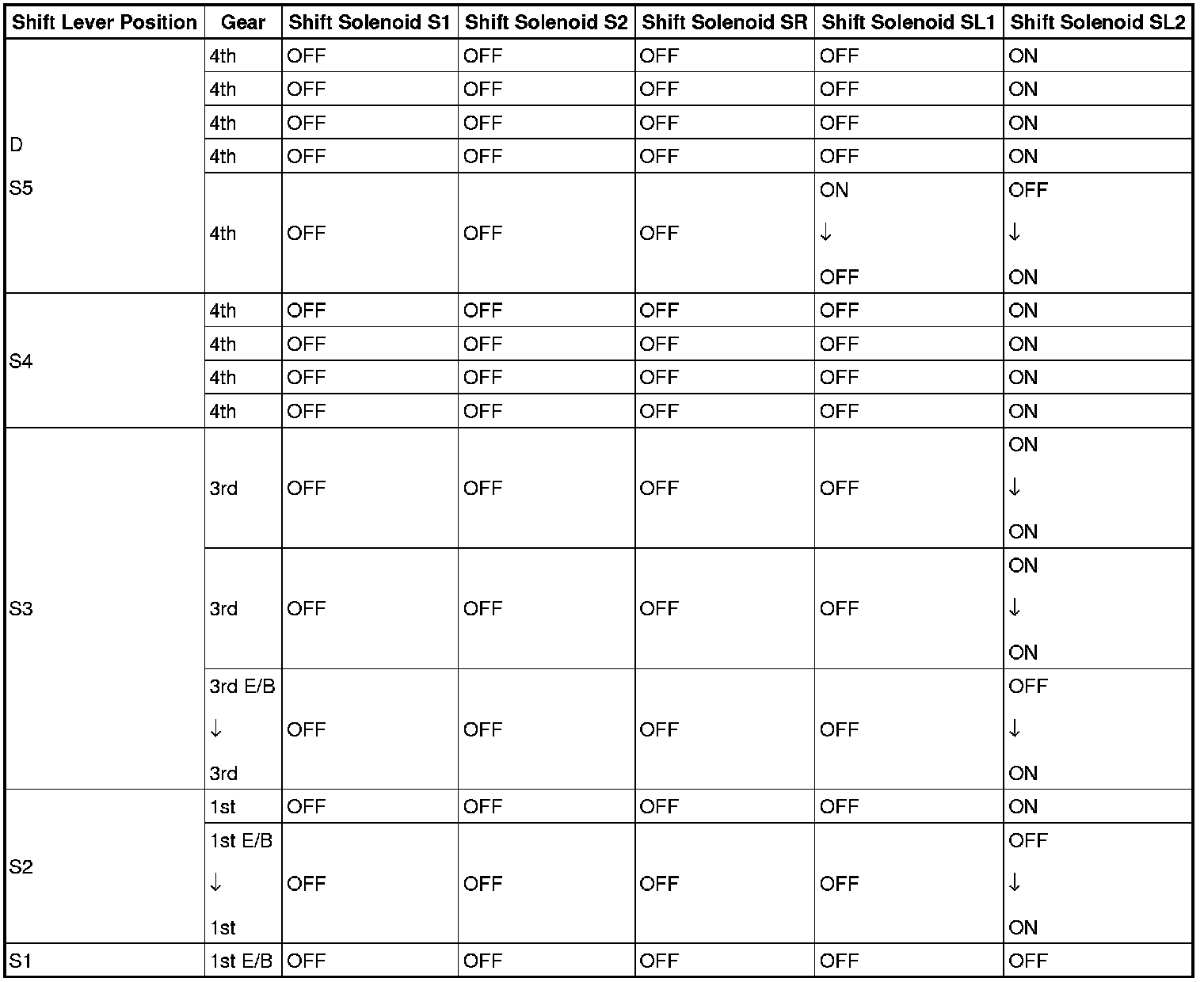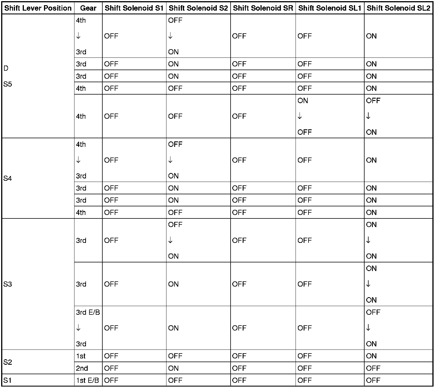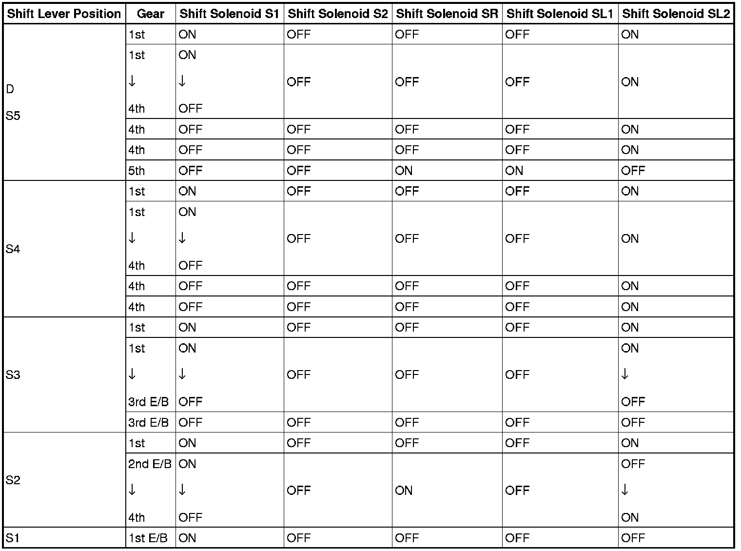 If any of the shift solenoid valve circuits has an open or short failure, the ECM turns the other shift solenoids ON and OFF in order to shift into the gear positions shown in the table below.