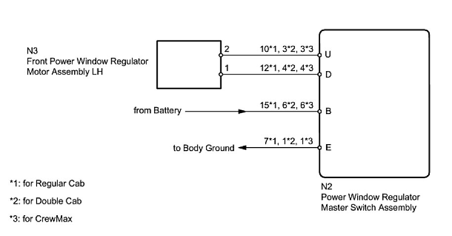 - The wiring between the power window regulator master switch and the front power window regulator motor LH (for driver side) is open or shorted.