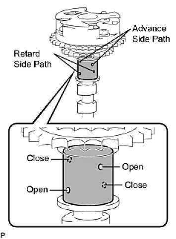 (5) When the camshaft timing exhaust gear moves to the most retarded position, release the air pressure from the advance side path, and then release the air pressure from the retard side path.