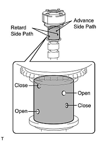 (4) Check that the camshaft timing gear revolves in the advance direction when reducing the air pressure applied to the retard side path.