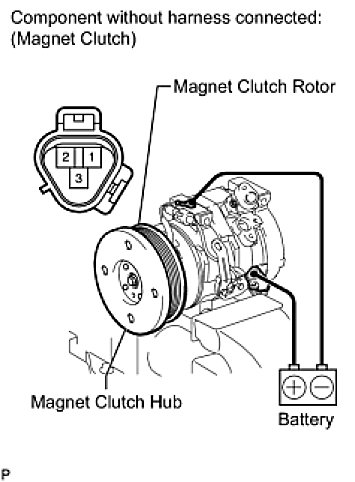 (1) Confirm that the magnet clutch hub and magnet clutch rotor lock when the battery positive lead is connected to terminal 3 of the magnet clutch, and the negative lead is connected to the ground wire.