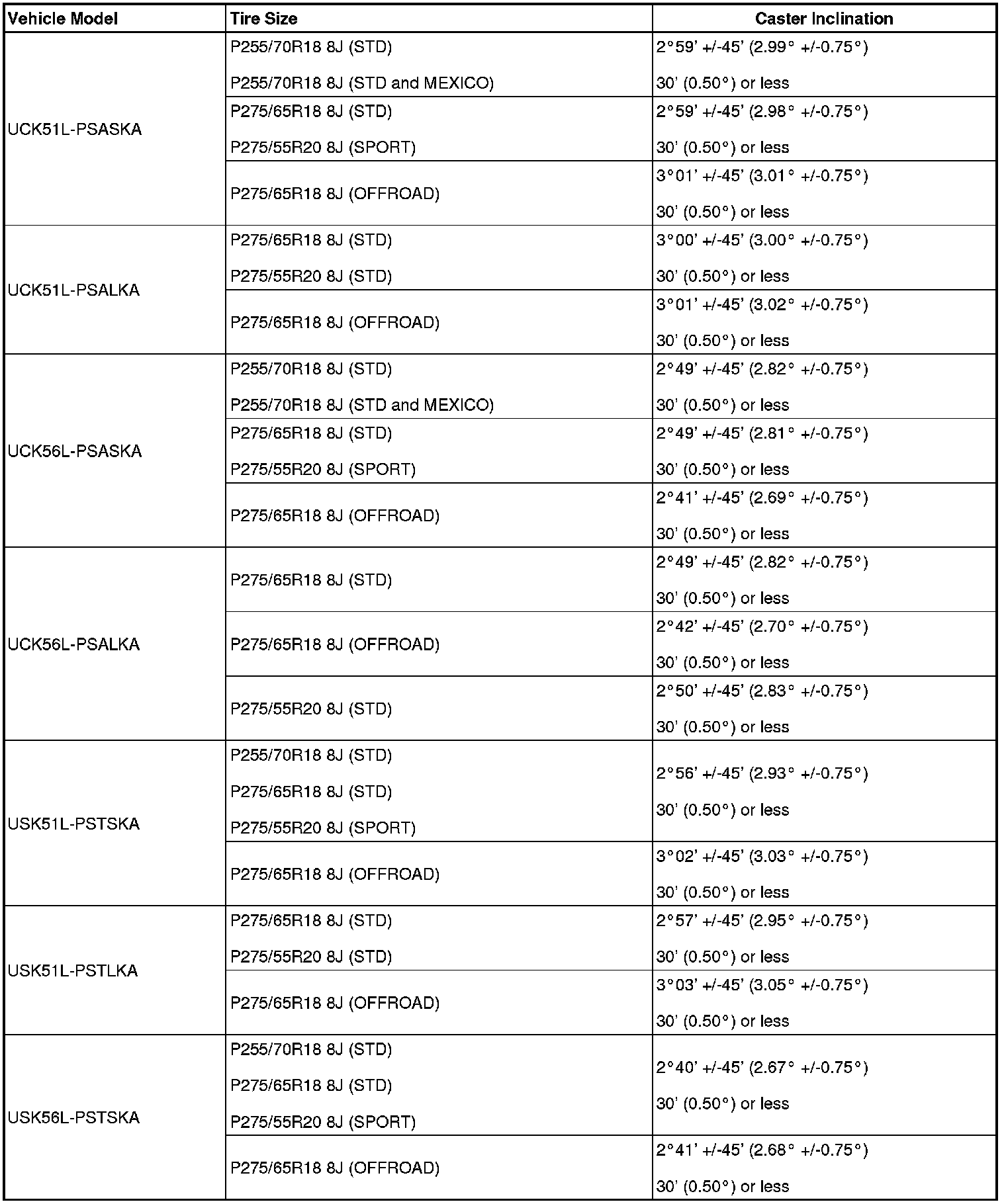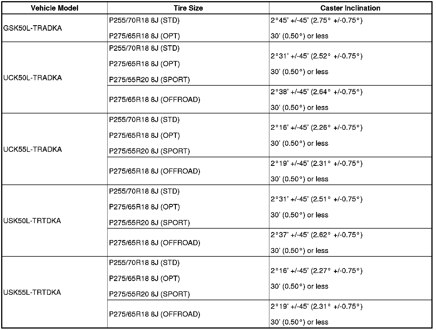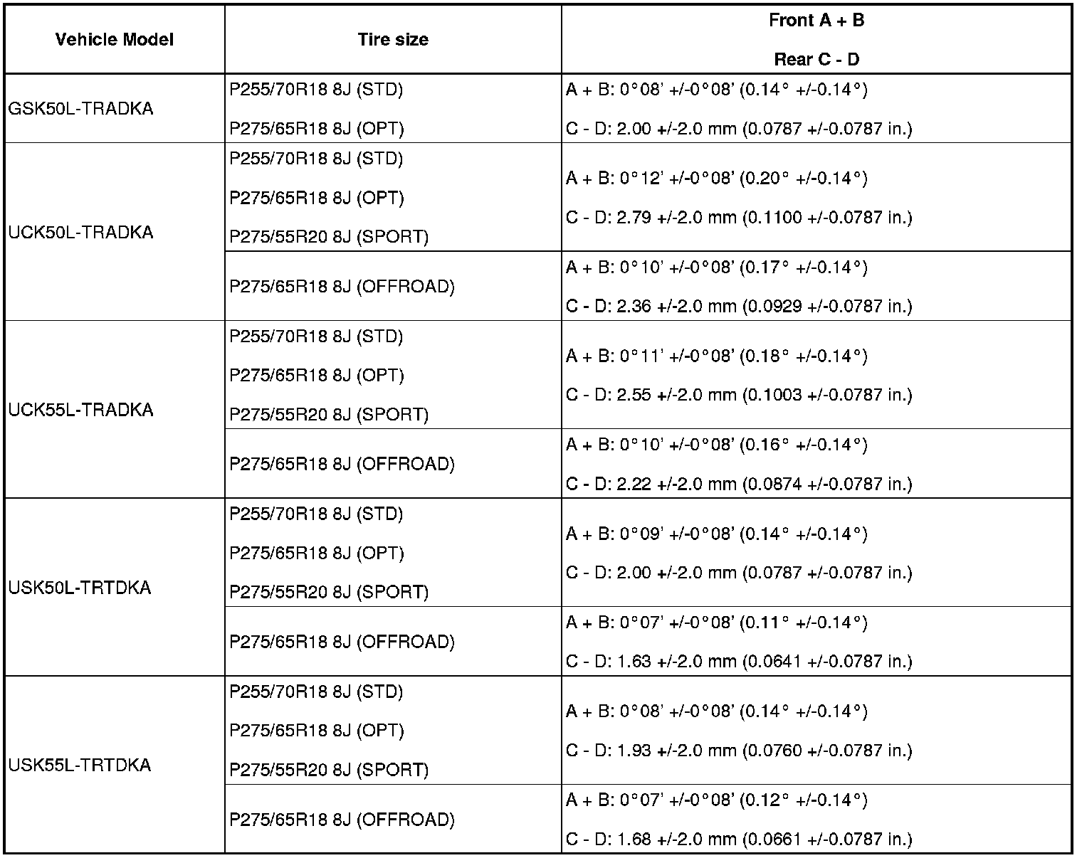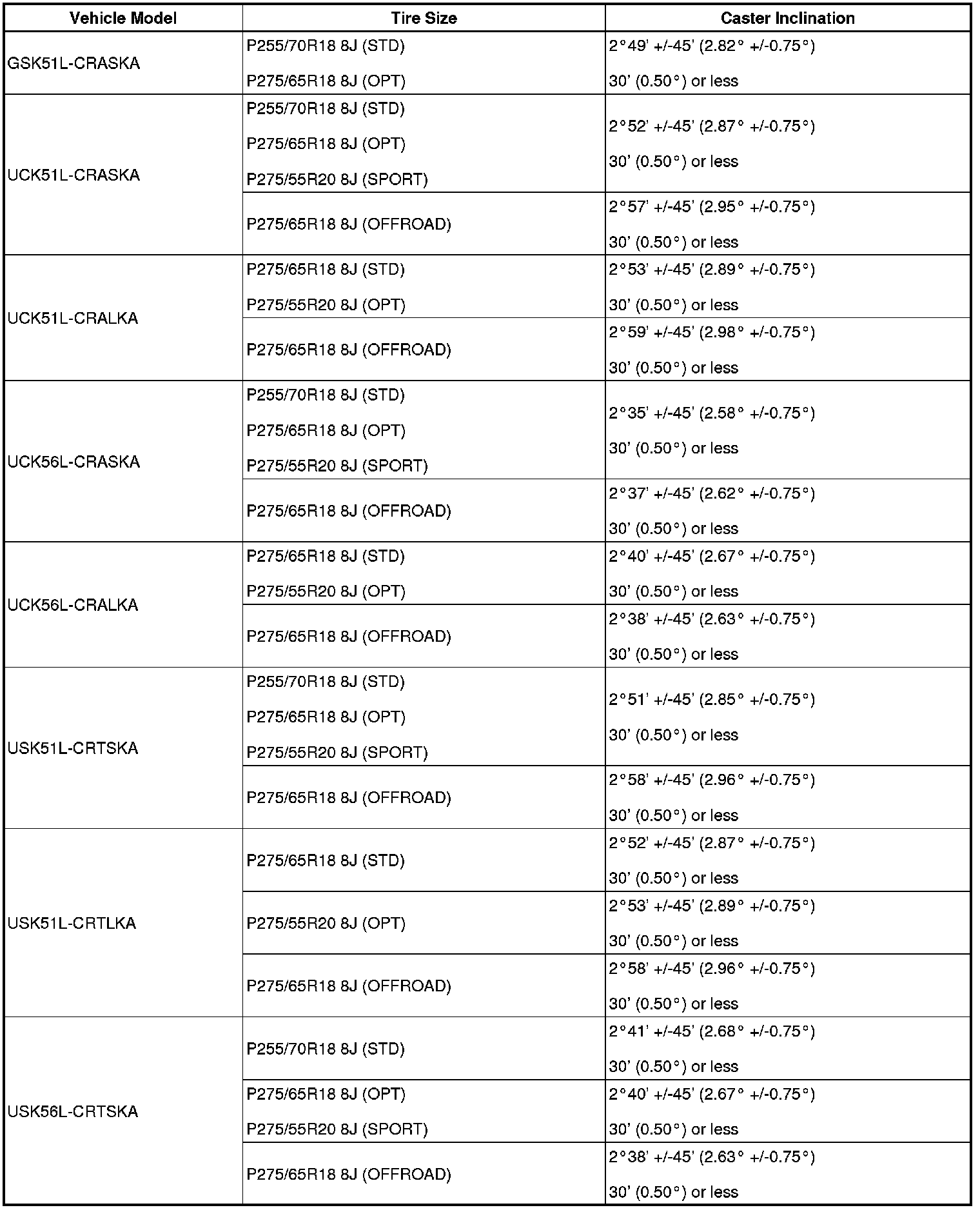 (1) Find the wheel alignment standard value applicable for the particular model.