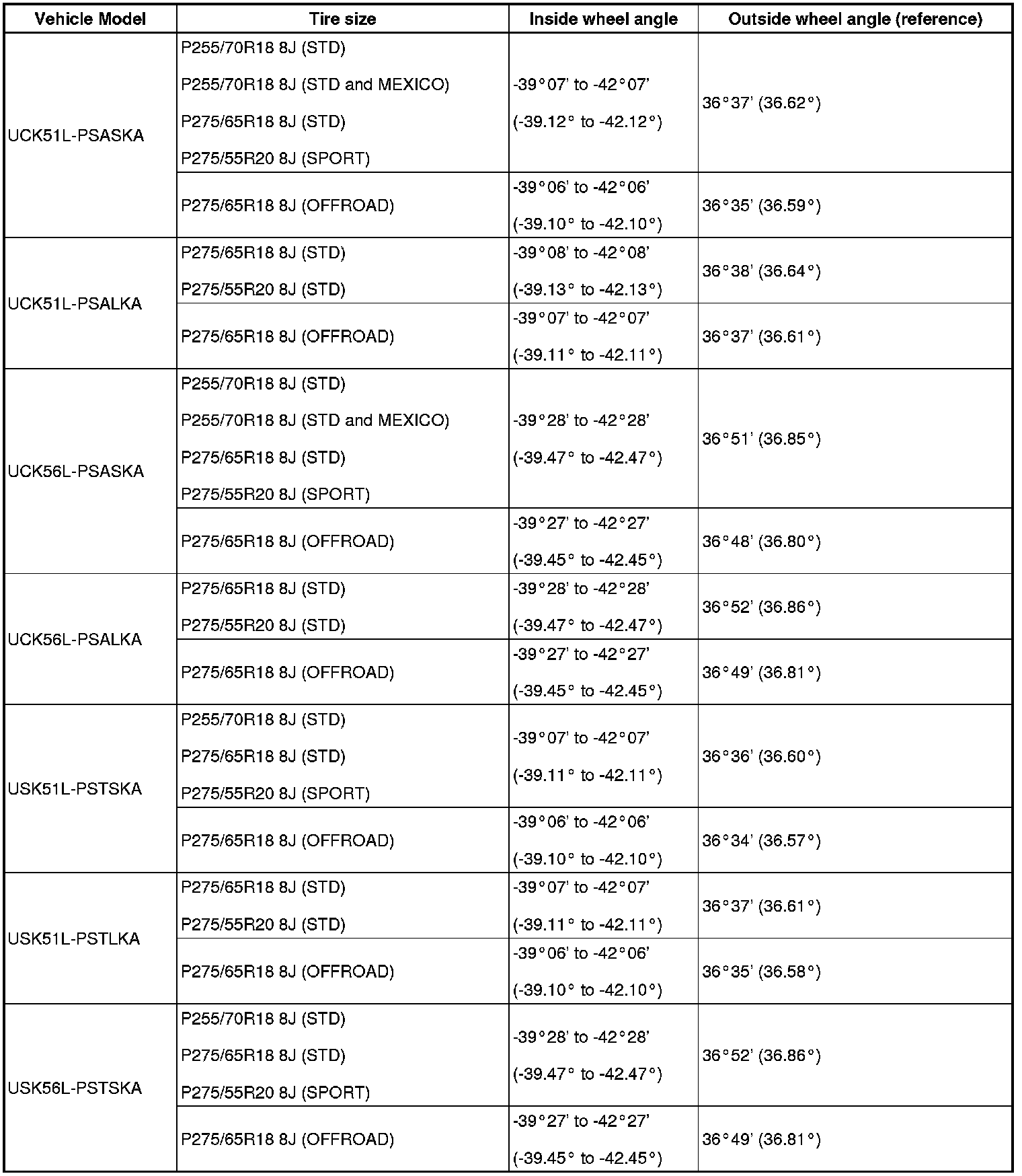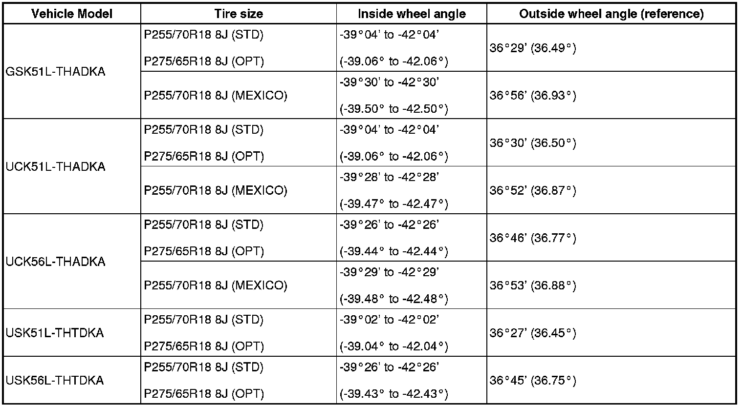 Standard wheel angle (unloaded vehicle):