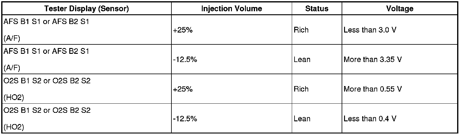 HINT: Malfunctioning areas can be identified by performing the Control the Injection Volume for A/F sensor function provided in the Active Test. The Control the Injection Volume for A/F sensor function can help to determine whether the A/F sensor, HO2 sensor and other potential trouble areas are malfunctioning.