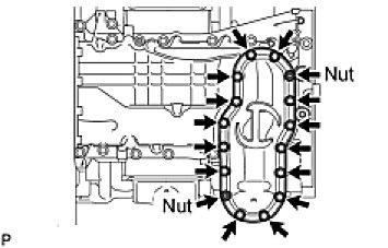 Install the oil pan with the 14 bolts and 2 nuts.