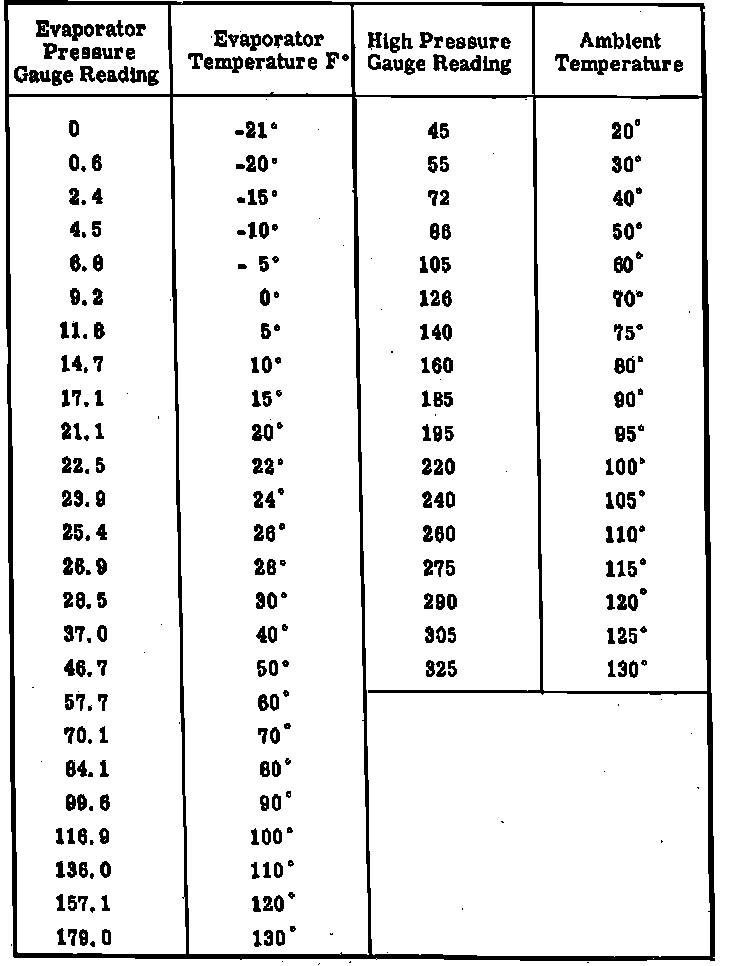 The high side pressure will definitely be affected by the ambient or outside air temperature. A system that is operating normally will indicate a high side gauge reading between 150---170 psi with an 80°F ambient temperature. The same system will register 210---230 psi with an ambient temperature of 100°F. No two systems will register exactly the same, which requires that allowance for variations in head pressures must be considered. Following are the most important normal readings likely to be encountered during the season.