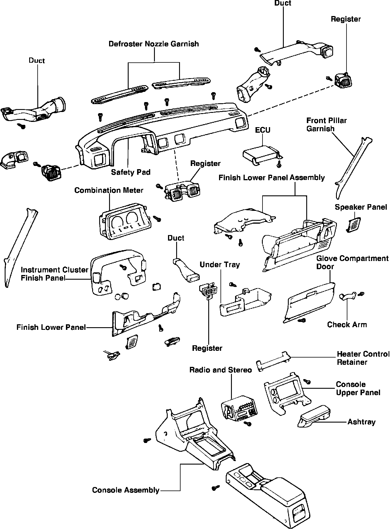 11. On Supra models, remove right side instrument panel under cover attaching screws, then the instrument panel under cover.