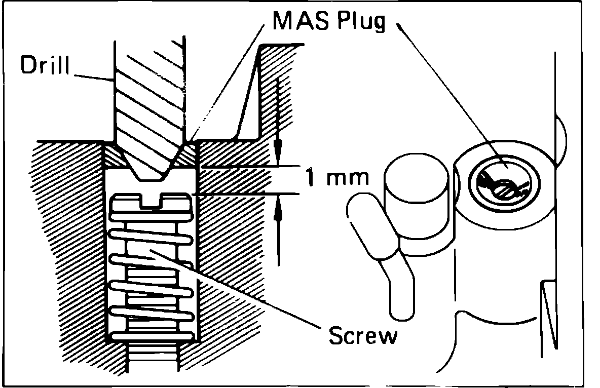 3. Center punch concealment plug, then drill a .256 inch (6.5 mm) hole in the center of the plug, Fig. 20. There is only a .04 inch (1 mm) clearance between the concealment plug and the mixture adjustment screw. Therefore, drill slowly and carefully to prevent damaging the idle mixture screw.