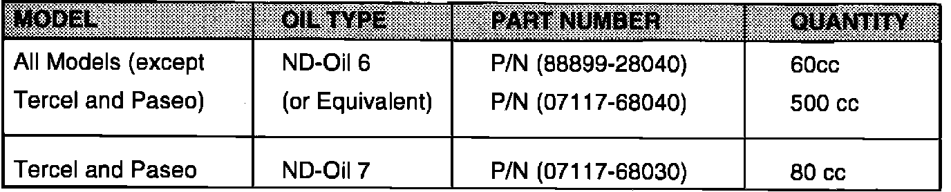 Use only the recommended oil for Tercel/Paseo thru-vane type compressors in order to prevent the possibility of compressor failure.