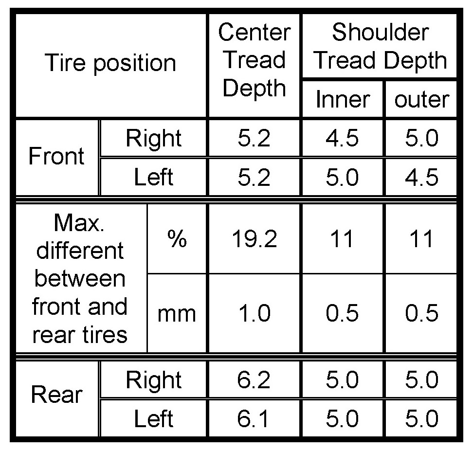 3. If one or both tires have equal or more than (20% or 1 mm) difference between the center front and rear tires, rotate the tires.