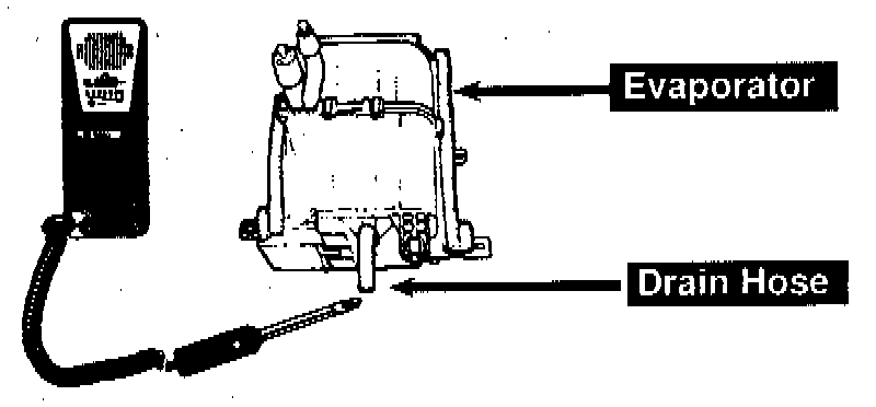 B. Checking for leakage at the evaporator: The evaporator drain hose provides an excellent access point to check for refrigerant leakage from the evaporator. Be sure to raise the Vehicle on a lift so that the evaporator is as far as possible from any petrochemical source that may be on the shop floor. When leak checking in this area, turn the system off, pinch off the evaporator drain hose, and wait 10 to 15 minutes to allow the refrigerant to accumulate in the evaporator case. When the system is ready to check, release the drain hose and hold the leak detector wand about 1/4 inch below the drain opening (see illustration below).