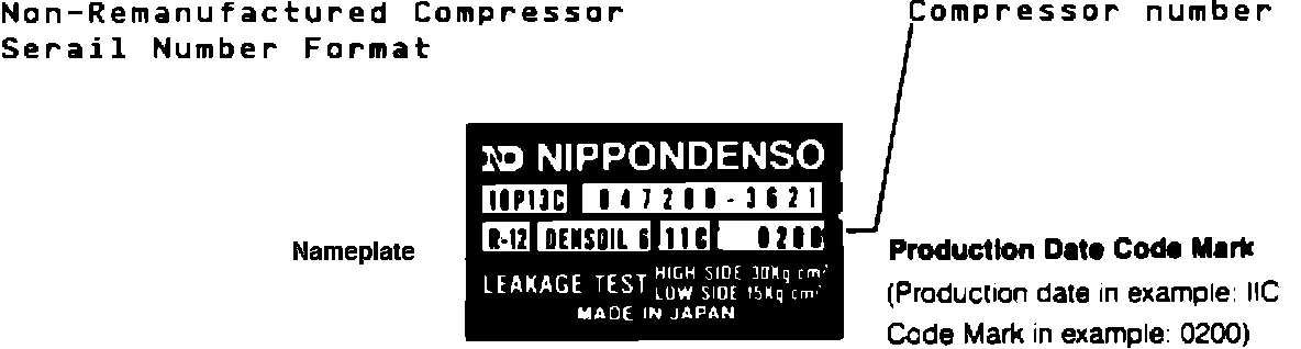 Please be advised that remanufactured A/C compressors have serial numbers that are in a different position and a different format than the serial numbers found on the non-remanufactured compressors. Original equipment serial numbers are formated, NNA-NNNNN. (example: 11C-00200). This number is found on the black & silver plate located on the back of each compressor, as shown in the example below.