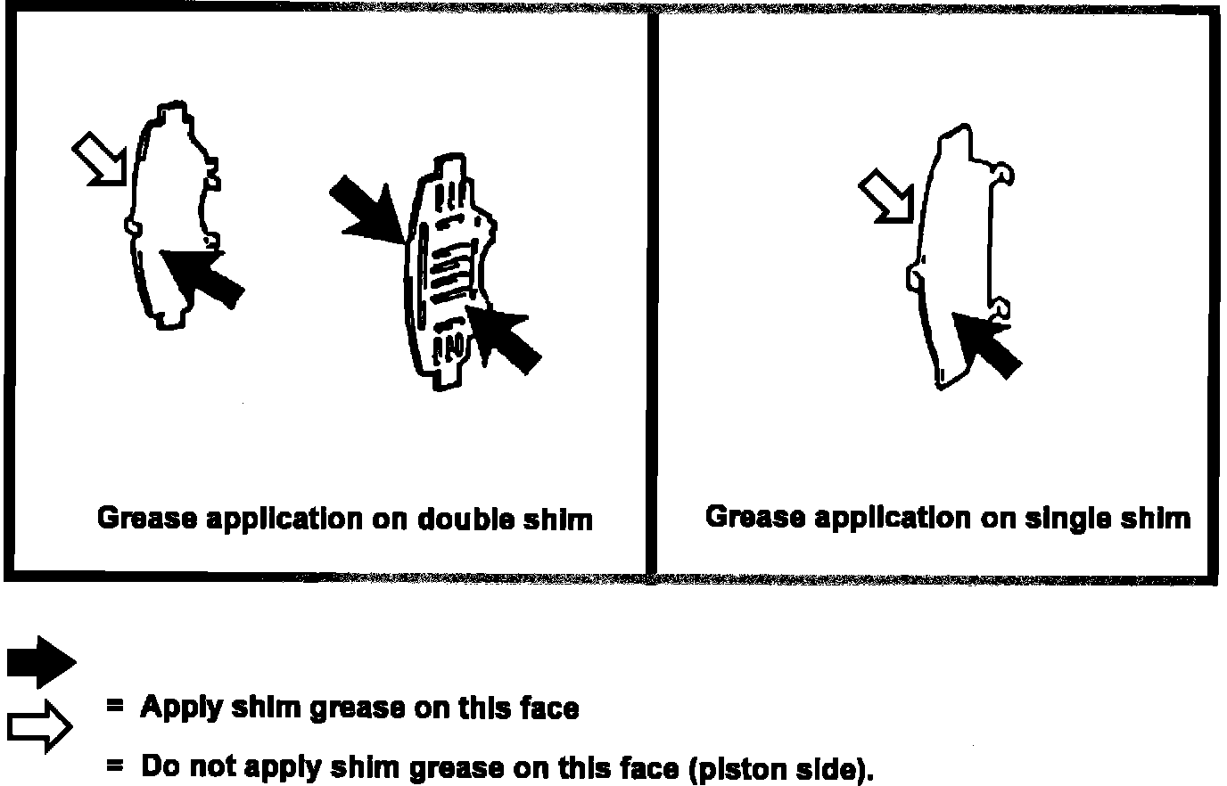 2) When applying shim grease, apply a thin layer over the shim faces as indicated.