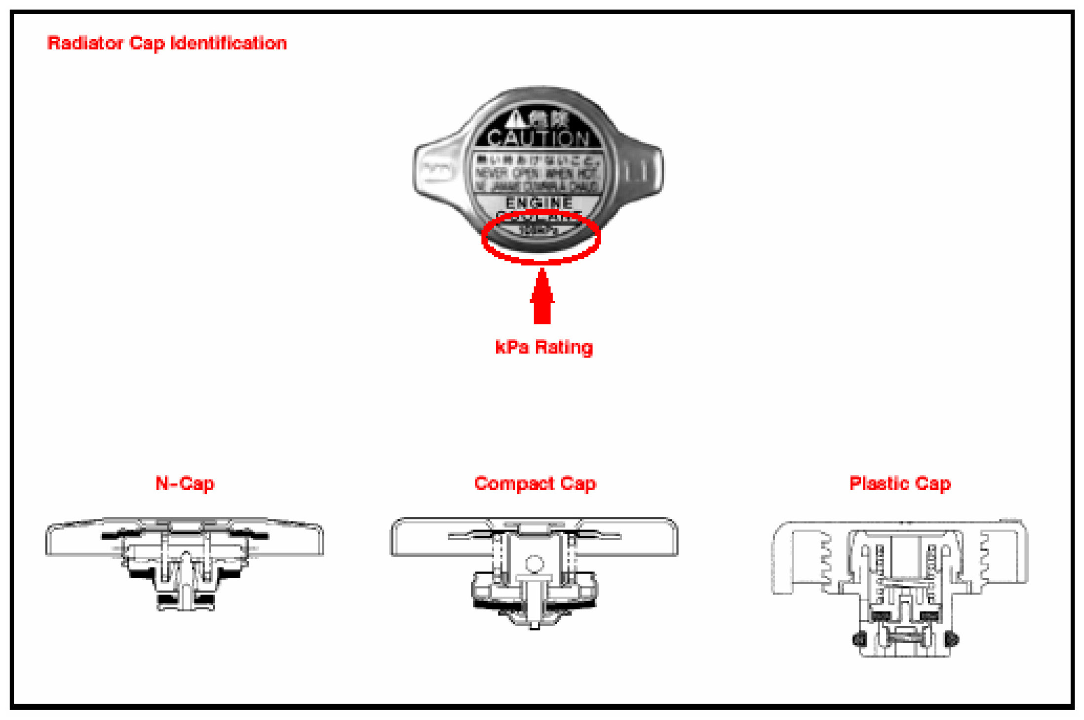 1. Use the illustration to identify the vehicle's radiator cap type and kPa rating.
