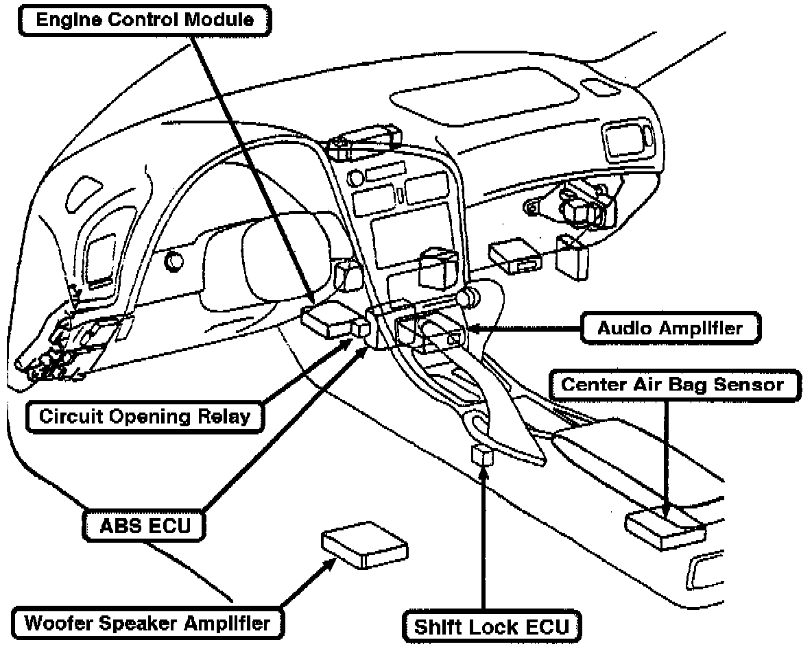 Electrical components, wire harnesses1 and connectors in the cabin and trunk areas are not waterproof and therefore, are not protected against excessive moisture that may occur during carpet cleaning. Additionally, some vehicles may have audio amplifiers, vehicle security system computers and CD changers under the front seat area which may be damaged by excess moisture. The illustration is an example of the typical component locations.