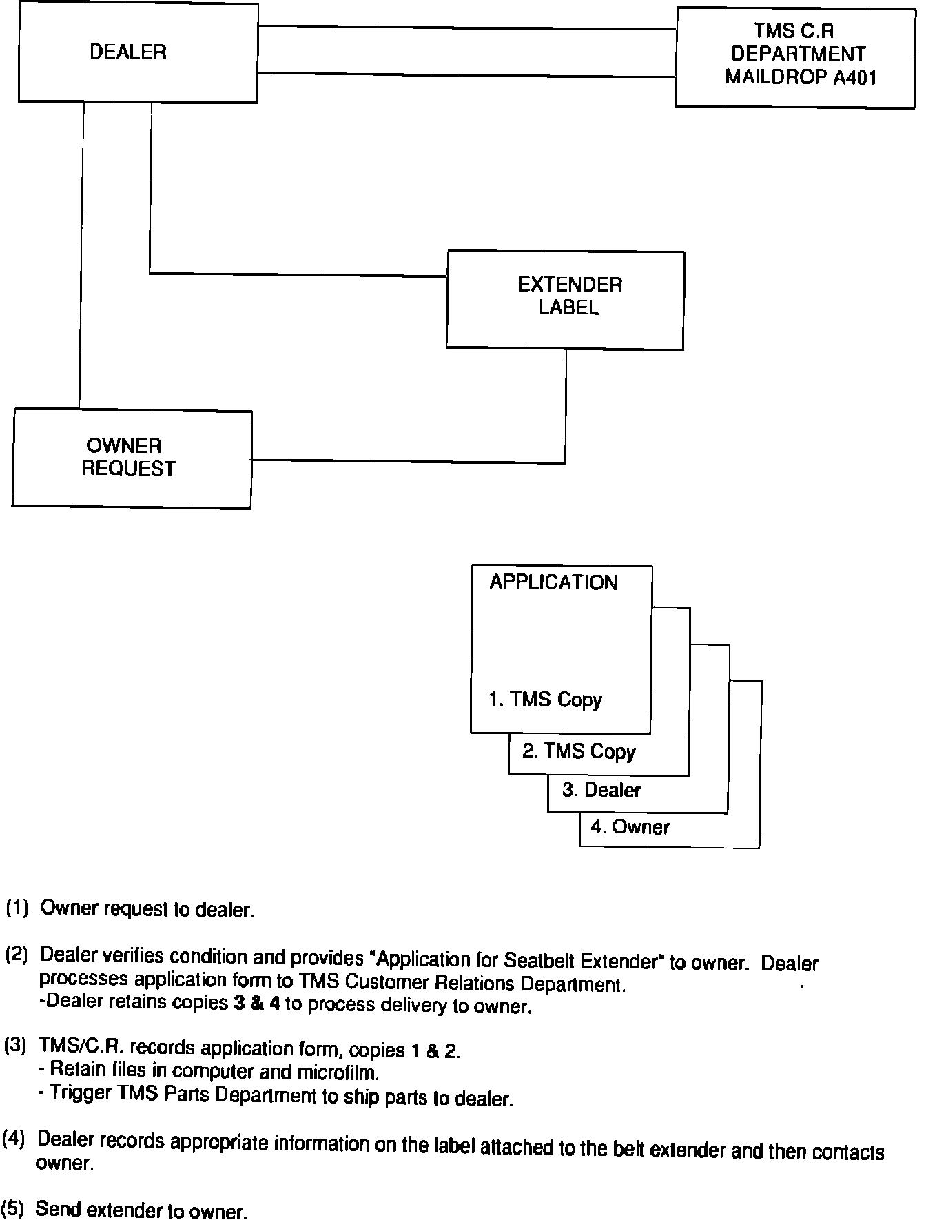 The customer will be required to visit a Toyota Dealership to have the required measurements made and complete the application form. The completed application form will be forwarded to the TMS Customer Relations Department to order the seat belt extender. (Additional application forms are available through Region/Private Distributor Customer Relations Departments.)