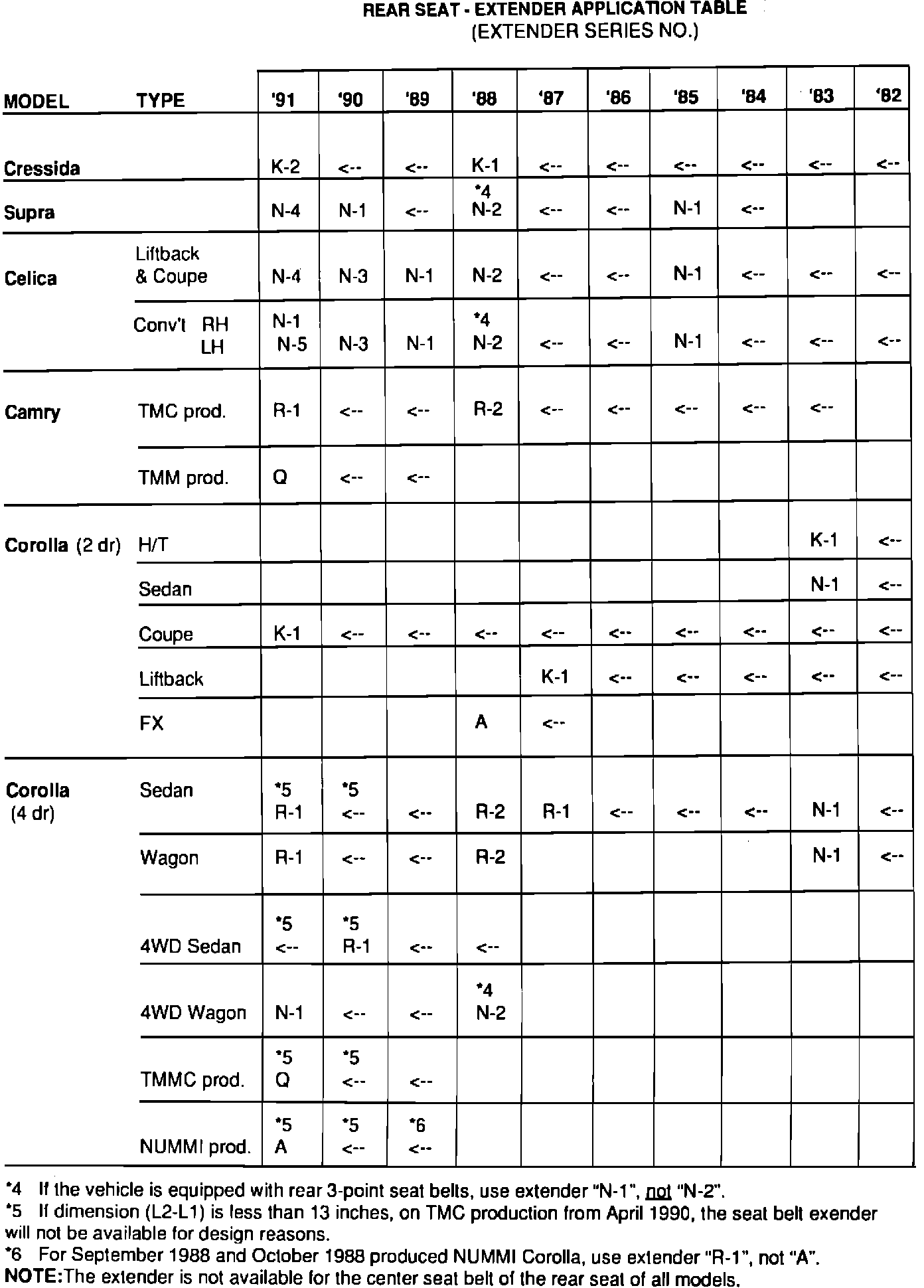 REAR SEAT - EXTENDER APPLICATION TABLE