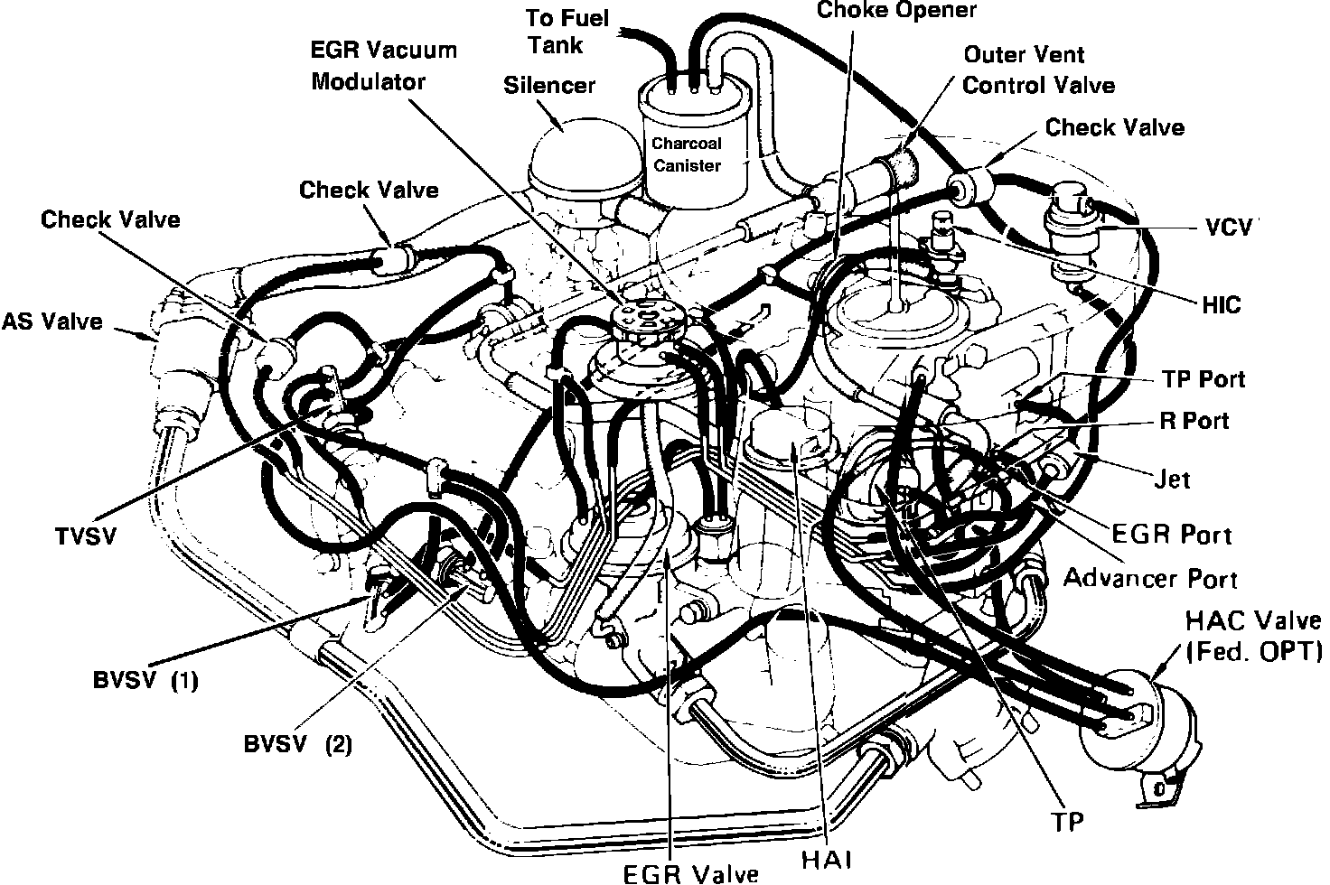 Fig. 7 Emission control system & engine compartment reference diagram. With high altitude compensation system: