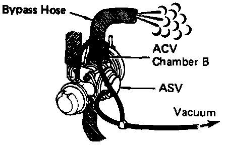 3. With engine idling, apply vacuum directly to air control valve chamber "B" and air switching valve chamber "A", Fig. 83. Compressed air should be discharged from air by-pass hose at idle.