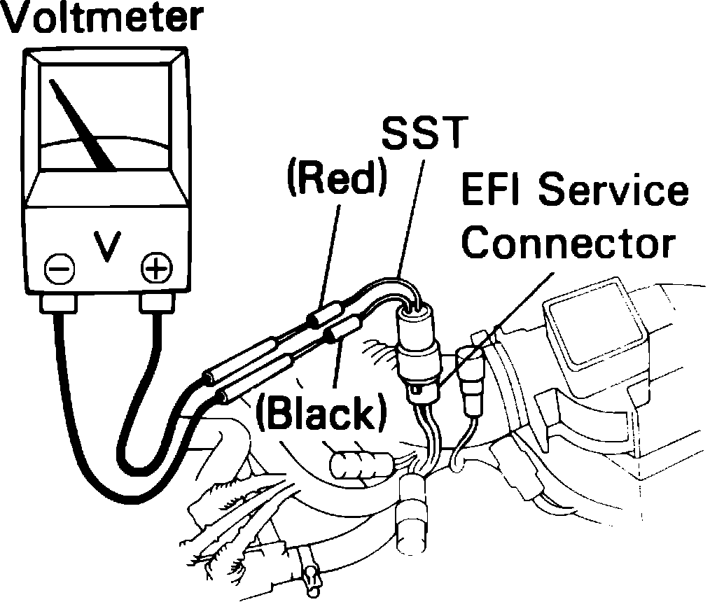 1. Connect voltmeter to EFI service connector using adapter 09842-14010 or equivalent, Fig. 44. Connector is located in harness with ``Check Engine'' connector.