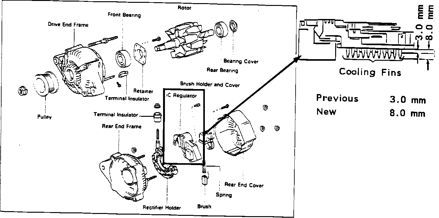 NOTE: 1) The new part (27700-63021) is not interchangeable with the previous regulator. However, after February 1983 production and after alternator lot number 2C**, it is interchangeable due to a change to the rear end cover to avoid interference between the IC regulator and cover.