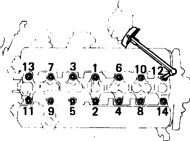 19. Loosen and remove cylinder head bolts a little at a time in sequence shown in Fig. 39.