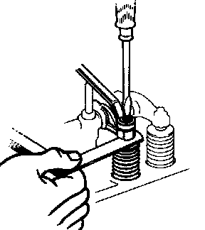 ^ Use a feeler gauge to measure between the valve stem and rocker arm. Loosen the lock nut and turn the adjusting screw to set the proper clearance. Hold the adjusting screw in position and tighten the lock nut.