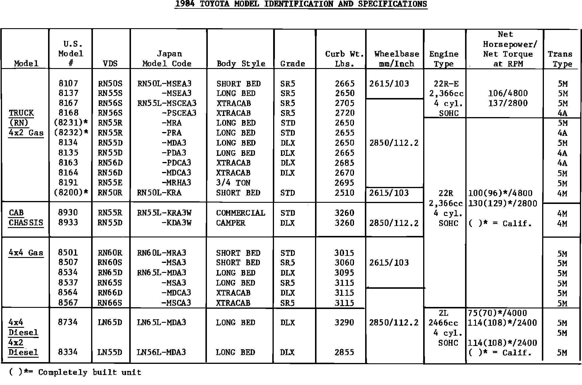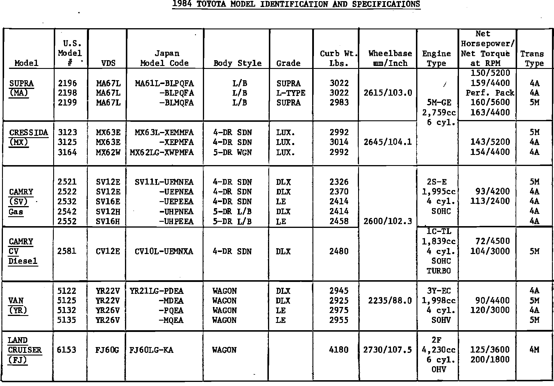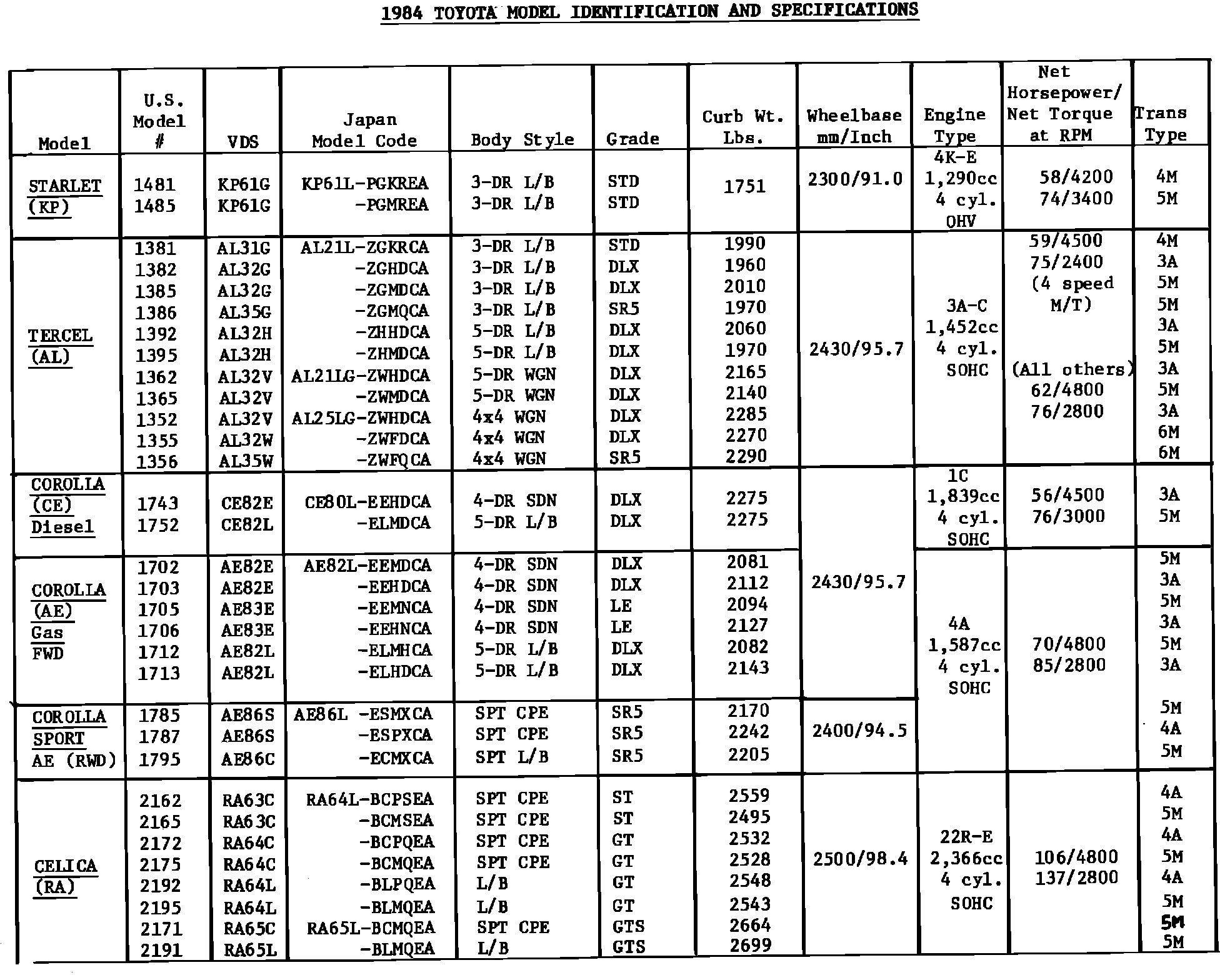 1984 Toyota Model Identification and Specifications