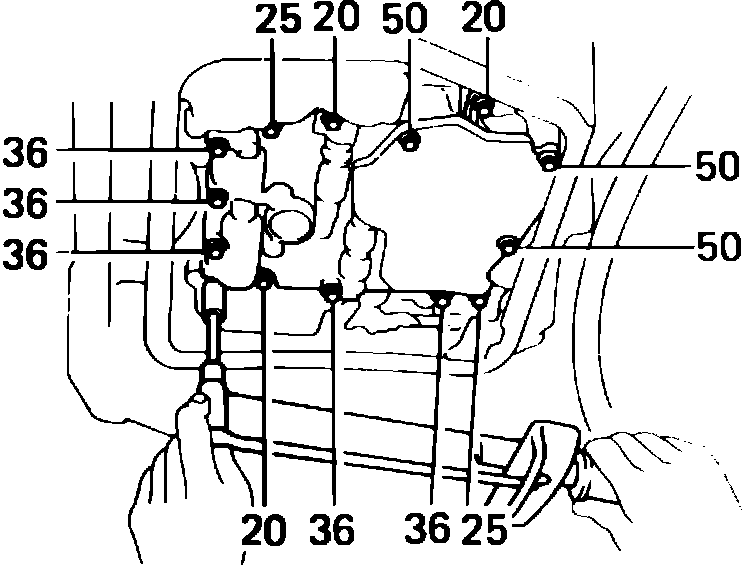 8. Insert and finger tighten attaching bolts, then torque 7 ft. lbs. Attaching bolt lengths (mm) are indicated in Fig. 7.