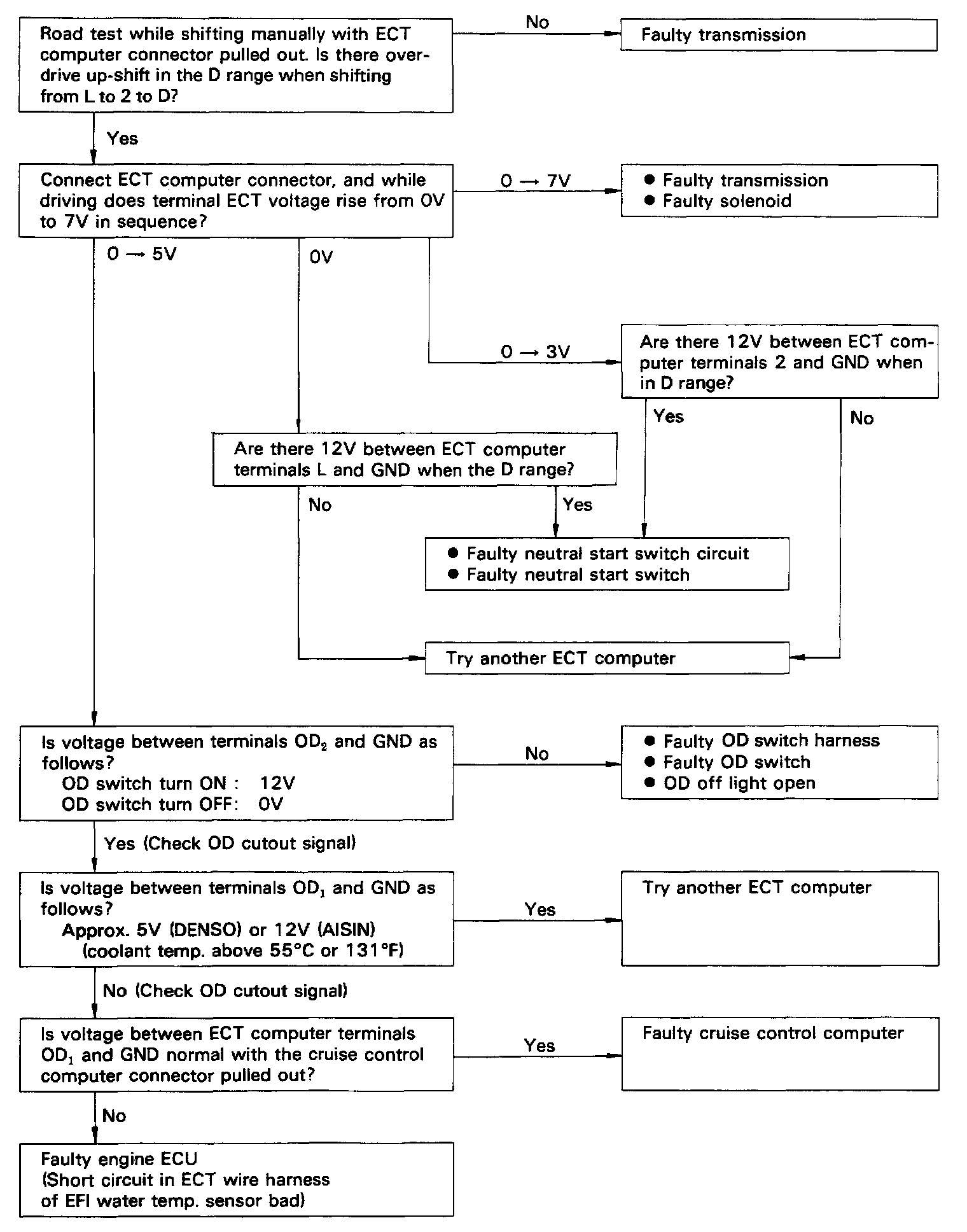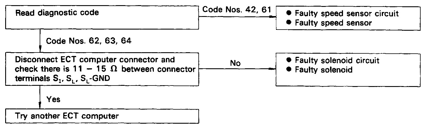 - If diagnostic code Nos. 42, 61, 62 or 63 occur, the overdrive indicator light will begin to blink immediately to warn the driver. However, an impact or shock may cause the blinking to stop; however, the code will still be retained in the ECT computer memory until canceled Out.