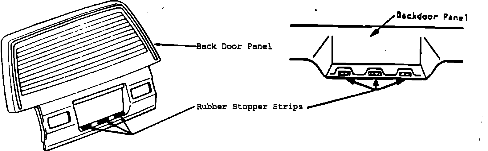 ^ Install three rubber stopper strips to the lower, outer portion of the back door as shown in the illustration below.