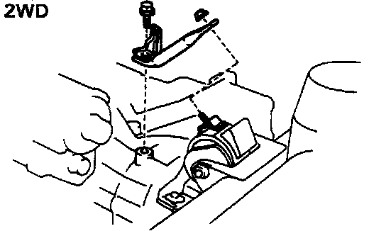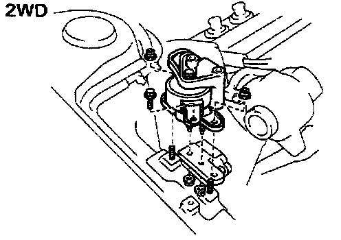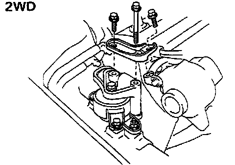 (d) Remove the through bolt, three bolts (2WD, M/T), four bolts (others) and LH mounting insulator.