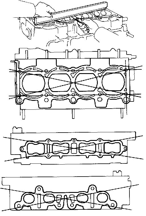 Using a precision straight edge and feeler gauge, measure the surfaces contacting the cylinder block and man for warpage.